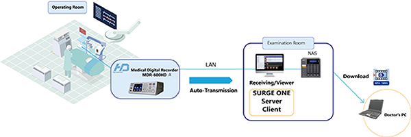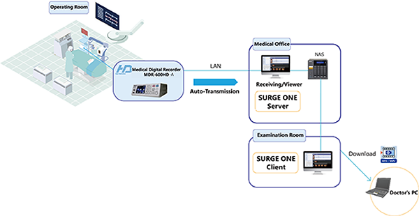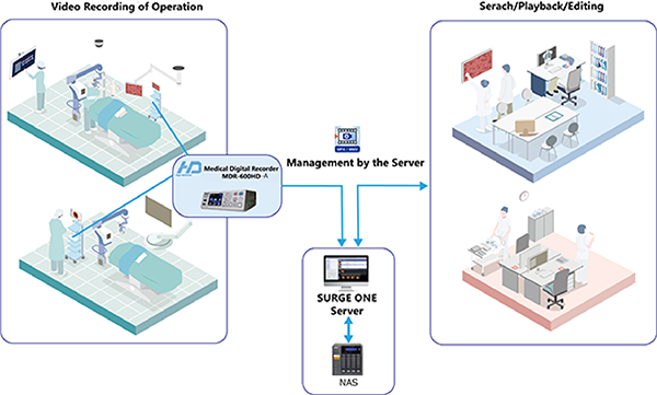 Surgery videos are captured via one-touch control. The recorded videos are automatically received by an Ikegami SURGE ONE Server.